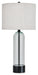 Details Made of glass and metal with drum hardback fabric shade, Clear glass, Metal with black finish, 3-way switch, 1 E26 socket, type A bulb recommended (not included); 150 watts max or LED equivalent; UL Listed, Minor assembly required; simply attach preassembled shade to lamp base