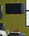 Details Made of metal and marble with black fabric hardback shade, Brass-tone and black metal finish, White marble base, 1 type A bulb (not included), 150 watts max or LED equivalent; UL Listed, Due to the use of natural materials, some variations may occur, Minor assembly required