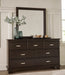 Details B441B9: Includes panel headboard, footboard, rails and slats, Made with hardwood solids, engineered wood veneer and MDF substrates, Dark brown finish, Floating panel headboard, Picture frame footboard, Foundation/box spring required, sold separately , Mattress available, sold separately, Assembly required, B441B1: Includes dresser and mirror, Made with hardwood solids, engineered wood veneer and MDF substrates, Dark brown finish, Metal bar pulls with bright nickel-tone finish, 7 smooth-gliding drawers with dovetail construction and metal center guides, Drawer interiors are lined with a wood grain laminate for a clean, finished look, Top moulding on dresser, Mirror attaches to back of dresser, B441-92: Made with hardwood solids, engineered wood veneer and MDF substrates, Dark brown finish, Metal bar pulls with bright nickel-tone finish, 2 smooth-gliding drawers with dovetail construction and metal center guides, Drawer interiors are lined with a wood grain laminate for a clean, finished look, Top moulding,