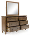 | Details | B787B4: Includes upholstered headboard, panel rails and bench footboard with slats, Made with hardwood solids, veneers and MDF substrates, Brown finish, Polyester upholstery, Nailhead trim, Turned feet, Foundation/box spring required, sold separately , Mattress available, sold separately, Assembly required, B787B1: Includes dresser and mirror, Made with hardwood solids, veneers and MDF substrates, Brown finish, Oil-rubbed bronze-tone knobs, 6 drawers with fully finished interior, dovetail construction and heavy duty ball-bearing side glides (top drawers felt lined), Turned feet, Mirror attaches to back of dresser, | |