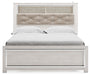 Details Includes queen upholstered panel bookcase headboard, panel footboard, platform rails and roll slats, Made with engineered wood (MDF/particleboard) and decorative laminate, Light finish with subtle pearl effect over replicated cedar grain with authentic touch, Gray polyester upholstery with faux crystal button tufting, Glitter panel inset bookshelf, Faceted chrome-tone accents, LED light strip with remote-controlled color and brightness options, Power cord included; UL Listed, Mattress available, sold separately, Bed does not require a foundation/box spring, Assembly required, Bed is compatible with an adjustable base