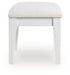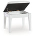 Details Made with solid wood frame, Bright white lacquer finish, Polyester upholstery, Foam cushion, Hinged seat reveals storage compartment, Assembly required