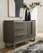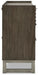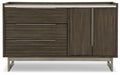 Details Made with rubberwood, mango veneer and engineered wood, Complex grayish brown finish, White marble top with gallery on 3 sides, Metal base with low-sheen steel finish, Bar pulls with low-sheen steel finish, 3 drawers with fully finished interiors, dovetail construction and soft-close ball-bearing side glides, Double-door cabinet with adjustable shelf