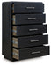 | Details | Made with hardwood solids and ash veneer, Black finish on textured wood grain surface, Burnished nickel-tone pulls, Waterfall edges, 5 smooth-gliding drawers with fully finished interior, dovetail construction and heavy duty ball-bearing side glides | |
