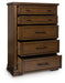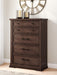 Style, simplicity and charm are hallmarks of this chest of drawers. Created with casual spaces in mind, it has the versatility to suit styles from craftsman to modern farmhouse. The rich brown finish aligns with your refined-meets-relaxed approach to everyday style. And for a timeless touch, five drawers with picture frame detailing accommodate your needs.