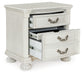 | Details | Made with hardwood solids, veneer and MDF substrate with cast resin components, Antiqued white finish, Metal pulls with polished pewter-tone finish, 2 smooth-gliding drawers with fully finished interiors, Drawers with French/English dovetail construction and heavy-duty ball-bearing side glides (pull-out tray and top drawer felt lined), Pull-out tray behind bottom drawer, Thick decorative moulding, Reeded bun feet | |