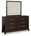 | Details | B618B5: Includes upholstered panel headboard, panel rails and panel footboard with slats, Made with hardwood solids, engineered wood and MDF substrates, Grayish brown wood-tone finish, Floating inset upholstered panel in polyester Next-Gen Nuvella fabric surrounded by LED backlight, Next-Gen Nuvella™ is a performance fabric that is soft, easy to clean, stain-resistant and durable, Clean fabric with mild soap and water, let air dry; for stubborn stains, use a solution of 4 oz. bleach to 28 oz. water, Light switch is located on each side of headboard and includes dual USB charging port (USB-A and USB-C), Power cord included; UL Listed, Foundation/box spring required, sold separately, Mattress available, sold separately, Assembly required, B618B1: Includes dresser and mirror, Made with hardwood solids, engineered wood and MDF substrates, Grayish brown wood-tone finish, Metal bar pulls with satin nickel-tone finish, 6 smooth-gliding drawers with dovetail construction and heavy duty ball-bearing side glides (top drawers felt lined), Mirror attaches to back of dresser, B618-46: Made with hardwood solids, engineered wood and MDF substrates, Grayish brown wood-tone finish, Metal bar pulls with satin nickel-tone finish, 5 smooth-gliding drawers with dovetail construction and heavy duty ball-bearing side glides (top drawers felt lined), B618-92: Made with hardwood solids, engineered wood and MDF substrates, Grayish brown wood-tone finish, Metal bar pulls with satin nickel-tone finish, 2 smooth-gliding drawers with dovetail construction and heavy duty ball-bearing side glides (top drawers felt lined), | |