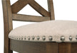 This upholstered bar stool might be simple at first sight, but a closer look reveals beauty in the details. With a distressed nutmeg finish, antiqued nailhead trim and textured polyester upholstery, it's beaming with charm. Cushioned seat ensures long, lingering meals are enjoyed in comfort.