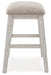 This upholstered stool invites you to raise the bar on small space living. An inspired choice for coastal chic or modern farmhouse settings, this comfortably cushioned stool sports a grayish white finish with rub-through effect for timeworn appeal.