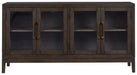 Details Made of wood, oak veneer and engineered wood, Dark, waxy brown oak finish, Metal accent bar pulls with brass-tone finish, 2 glass front cabinets with double doors, Cabinets with single adjustable shelves, Assembly required