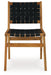 Details Made with acacia wood, Solid wood frame, Light wood-tone finish, Woven black leather straps, Nailheads with brass-tone finish