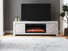 This TV stand with electric fireplace embraces a classically charming aesthetic and repurposes it for modern living. Its whitewash replicated paint appeals to your love of vintage character, while the chic chevron pattern is effortlessly on trend. Media accessories stay tucked away in style thanks to hidden storage behind the doors. And for added ambiance, the electric fireplace brings a cozy-cool vibe to your living room. With the touch of a button, activate the LED-lit flame and adjust the temperature or the flame brightness. The flame effect includes multiple color options and a realistic-looking faux birch log set.