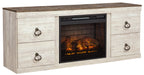 | Details | Includes TV stand and electric fireplace insert (W100-101), Made with engineered wood (MDF/particleboard) and decorative laminate, Replicated white wash worn through paint; TV stand top with replicated wood grained block pattern with an authentic touch, Antiqued brass-tone ring pulls, TV stand with open storage area and 2 single-door storage areas (each with adjustable/removable shelf), Cutouts for wire management and ventilation, Electric fireplace insert provides up to 5,386 BTU/1,500W and warms up to 1,000 square feet (heats larger rooms), 7-level temperature setting; 5 levels of flame brightness, LED-lit multi flame display operates with or without infrared heat; realistic-looking log set with dynamic glowing embers, Remote control with LED display, Timer function with programmable ranges from 10 minutes to 9 hours; overheating control device, Power cord included; UL Listed, Assembly required; simply remove the center shelf and back panel to make room for the fireplace insert | |