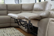 Experience ultimate comfort with this power reclining sectional. Generously cushioned with plush bustle back styling and pillow top track arms, it's wrapped in a richly neutral upholstery that’s oh-so soft. Jumbo stitching gives the sectional added definition. The one-touch power control and USB charging take the pleasure of reclining to a higher level, while a console with storage and dual cup holders marries function with great form.