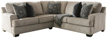 Details Includes 2 pieces: right-arm facing sofa with corner wedge and left-arm facing loveseat, "Left-arm" and "right-arm" describe the position of the arm when you face the piece, Corner-blocked frame, Attached back and loose seat cushions, High-quality foam cushions wrapped in poly fiber, Includes 5 accent pillows, Pillows with soft polyfill, Textured polyester chenille upholstery, Polyester; polyester/polypropylene pillows, Exposed feet with faux wood finish, Platform foundation system resists sagging 3x better than spring system after 20,000 testing cycles by providing more even support, Smooth platform foundation maintains tight, wrinkle-free look without dips or sags that can occur over time with sinuous spring foundations