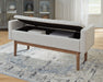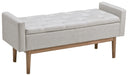 Contemporary style gets practical with this bench. The tufted beige seat cushion is hinged to allow easy access to whatever you need to hide in plain sight. Raised edges give the impression of arms, while the light brown finished wood legs help it blend with many different modern styles.