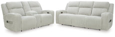 Trend-right style, meet irresistible modern function. Your living room gets a cozy-cool upgrade with this power reclining seating package. Curl up in its ultra-chic corded fabric and recline with one-touch controls. Is it movie night or game time? With ambient LED lighting, this set transforms from a serene relaxation spot to an entertainment hub. USB charging, cup holders and storage cutouts make lounging all the more convenient.