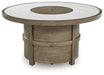 Experience the perfect combination of durability and style with this outdoor fire pit table. An aluminum frame with a wood-look finish maintains a sleek, contemporary aesthetic, while the sintered stone tabletop adds an element of natural elegance. A stainless steel burner with glass beads adds a captivating element sure to wow. This delightful addition to your outdoor dining creates an oasis where comfort and beauty thrive.