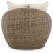 This swivel lounge chair completes your outdoor seating area with its fresh take on casual comfort. Handwoven resin wicker over a curving aluminum frame balances streamlined style and exceptional durability. High-performance beige Nuvella+™ fabric wraps the seat and back cushions, protecting against the natural elements.