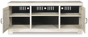 Express your farmhouse style with this TV stand. Its wispy white finish over replicated oak wood grain is a delightful change from the ordinary. Clean-lined, classic styling with barn door inspiration provides a country chic aesthetic that’s a breath of fresh air. Feel free to add an optional electric fireplace for instant warmth and romance. (Compatible with W100-101 and W100-02 fireplace insert models, sold separately.)