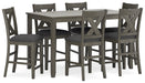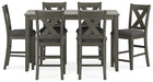 | Details | Includes counter height dining table and 6 counter height bar stools, Table made with hardwood solids, acacia veneer and MDF substrate, Stools made with solid hardwood frames, Antiqued gray wash finish, Polyester upholstery, Foam cushioned seats, Nailhead accents, Assembly required | |