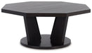 | Details | Made with mango wood veneer and MDF substrates, Dark espresso brown finish, Octagonal top, Trapezoid-shaped legs set on round plinth base, Assembly required | |