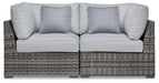 Details Set of 2, All-weather resin wicker handwoven over rust-free aluminum frame with durable powder coated finish, Loose, reversible cushions, Easy-clean polyester (Nuvella®) upholstery remains vibrant and resists stains, All-weather foam cushion core wrapped in soft polyester, Clean fabric with mild soap and water, let air dry; for stubborn stains, use a solution of 4 oz. bleach to 28 oz. water, 4 throw pillows included, Imported fabric and fill, Can be sold individually or with other pieces in the sectional, Stainless steel hardware, Assembly required