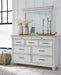 | Details | Includes dresser and mirror, Made with solid wood, veneers and engineered wood, Distressed whitewash finish, Dark gray pewter-tone finished metal hardware, 7 smooth-gliding drawers, plus 2 small-scaled accessory drawers, Mirror attaches to back of dresser, Assembly required | |