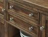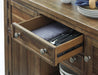 This dining room server might be simple at first sight, but a closer look reveals beauty in the details. With the plank-effect cabinet doors and table top, distressed nutmeg finish and antiqued bronze-tone hardware, it’s simply beaming with charm. The server’s mix of drawer, cabinet and shelf space will serve you well for years to come.