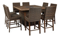 | Details | Accommodates up to 8; bar stools sold separately, Door conceals gas propane tank (not included), Rust-proof aluminum frame with wood-look tabletop, Side panels accented with all-weather, handwoven resin wicker, 56" square fire pit table with CSA-approved 55,000 BTU stainless steel burner, glass beads, burner cover and enclosed storage area with shelves, Battery-operated ignition system with adjustable flame control; battery included, Convertible to natural gas, Gas line or propane tank connector hose not provided, Assembly required, Comes with protective weather cover | |
