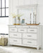 | Details | B777B1: Includes dresser and mirror, Made with solid wood, veneers and engineered wood, Distressed whitewash finish, Dark gray pewter-tone finished metal hardware, 7 smooth-gliding drawers, plus 2 small-scaled accessory drawers, Mirror attaches to back of dresser, Assembly required, B777B4: Includes queen upholstered headboard, panel footboard and rails, Made with solid wood, veneers and engineered wood, Distressed whitewash finish, Button tufted fabric upholstery, Nailhead trim, Foundation/box spring required, sold separately, Mattress available, sold separately, Assembly required, | |