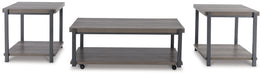 | Details | Includes coffee table and 2 end tables, Made with MDF substrate, decorative paper laminate and metal, Laminate features a replicated wood grain with a weathered gray coloration, Metal frame with gunmetal powder coat finish, Open storage shelf, Coffee table with casters for easy mobility, Assembly required | |